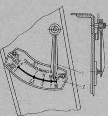 (мал. 138) складається з метал ическо1 сектора 2 з шкалою, укріпленого i стрілі, і шарнірно підвішеною стр. ки 1, вказуючою грузоподъемност що допускається при роботі на цьому вь літі стріли.