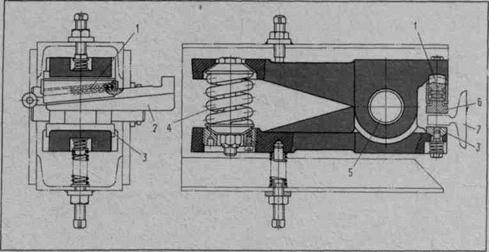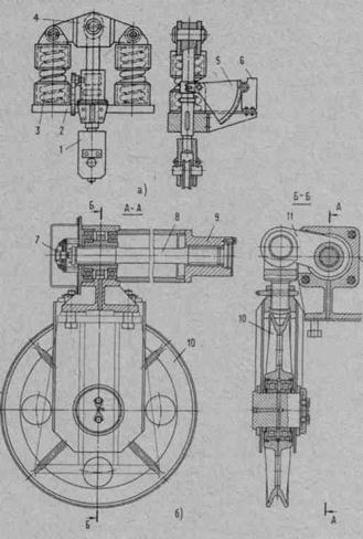 Пружинний обмежувач вантажопідйомності (мал. 139, а), вживаний в баштових і портальних кранах, має траверсу 4, що спирається на дві пружини стиснення 3, встановлені на нерухомій підставі 2. Кінець вантажного каната прикріплений до вилки 1 штока обмежувача, сполученого з траверсой. При перевантаженні крана більш ніж на 10% пружин 3, деформуючись, повертають зубчатий сектор 5, який сполучений з шестернею, встановленою на валику кінцевого вимикача 6. Це приводить до розмикання ланцюга управління електродвигуном підйому.