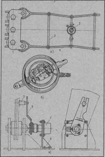 3 (мал. 140) встановлюють між розпірками 2 і розтяжками 4, що сполучають стрілу з рухомою обоймою / поліспасту. Він є кільцевим динамометром з потенциоме-трическим перетворювачем, що видає електричний сигнал, пропорційний вимірюваному зусиллю. Силоїз-мерітельним елементом датчика є пружне кільце, що розтягується під дією зусиль в розтяжках, пропорційних вазі вантажу, що піднімається. Деформація кільця через спіральну пружину передається на передавальний механізм, що перетворює лінійне переміщення тяги динамометричного кільця в кутове. Датчик кута нахилу 7 встановлений на кронштейні 8 співісних з віссю повороту стріл і зв'язаний повідцем 6 з пальцем 5, закріпленим на стрілі. При зміні нахилу стріли повертається вал датчика, пов'язаний з важелем потенциоме-трического перетворювача. У даному обмежувачі вантажного моменту використовується принцип порівняння електричних сигналів від датчиків зусилля і кута нахилу стріли. Прилад спрацьовує при різниці електричних сигналів, рівній нулю, що відповідає наявності максимально допустимого навантаження.