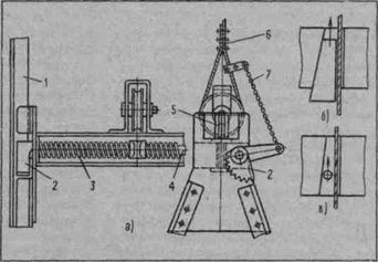 рейкові (в), Найбільш простими є рейковий і гвинтовий механізми, що мають порівняно невелику металоємність. З цих механізмів найбільш поширений рейковий механізм (мал. 104, а). як один з найбільш легких і простих у виготовленні. Він має зубчату або цевочную рейку 1, переміщувану приводною шестернею 2 в тих, що направляють, що коливаються. Рейка шарнірно сполучена із стрілою.
