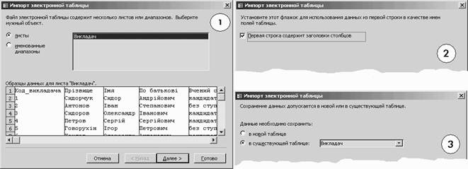 Для створення та заповнення даними таблиць можна також використовувати функцію імпортування даних MS ACCESS. Імпортування даних передбачає створення у поточній базі даних об’єкту (таблиці, запиту, звіту тощо) на основі деякого об’єкту, що зберігається у іншій базі даних чи у електронній книзі MS EXCEL. При цьому якщо таблиця зберігається у книзі MS EXCEL, то перший рядок таблиці EXCEL повинен містити назви полів таблиці.