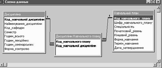 Для організації складних і ефективних моделей даних окремі таблиці, що входять до бази даних, зв’язуються між собою співвідношенням “один до багатьох”. Принцип зв’язування таблиць співвідношенням “один до багатьох” полягає в можливості співставляти одному запису в першій таблиці будь-яку (багато) кількість записів другої таблиці. Принцип побудови зв’язку між таблицями продемонструємо на прикладі двох об’єктів “Задачі автоматизації діяльності навчальної частини по управлінню навчальним процесом”. Щоб записати повну модель об’єкта Навчальний план необхідно використати 3 таблиці: Навчальний план, Дисципліна, Дисципліни_Навчального_плану. Перші дві таблиці несуть загальну інформацію про прості об’єкти Навчальний план і Дисципліна, третя таблиця показує, з яких саме дисциплін складається конкретний навчальний план. Тобто третя таблиця дозволяє вказати, що до одного Навчального плану можуть входити багато Дисциплін. Так само, як одна дисципліна може входити до багатьох Навчальних планів.