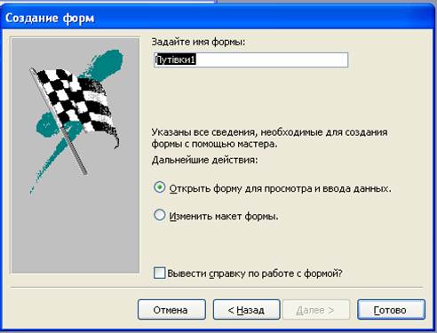 4. Останній етап пропонує задати ім’я для нової форми. Тут потрібно ввести ім’я Путівки і в якості подальших дій вибрати пункт Открыть форму для просмотра и ввода даных.