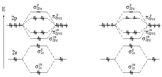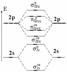 Принцип ее построения и смысл параметров ясен из рисунка: по бокам изображены АО исходных атомов с соответствующим числом электронов, а между ними - МО с теми же электронами, что были на АО. По вертикали откладывается энергия. МО заполняются электронами в соответствии с общими квантово-механическими правилами. Диаграмма называется корреляционной, так как показывает, из каких АО получаются данные МО (то есть корреляцию между АО и МО).