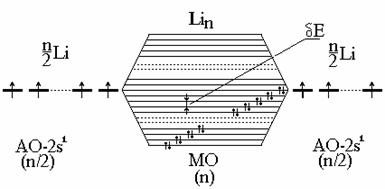 Если взять, например, N атомов Li, имеющих по одному валентному электрону на одной атомной орбитали (2s1), то при их взаимодействии образуется столько же МО. Так как на каждой МО может быть 2ē, то лишь половина МО будет занята. Расстояние между соседними МО - dЕ - чрезвычайно мало, поэтому поглощение любого кванта энергии (даже тепловой или энергии внешнего поля) вызывает возбуждение электрона; это объясняет сплошной спектр и высокую подвижность электронов.