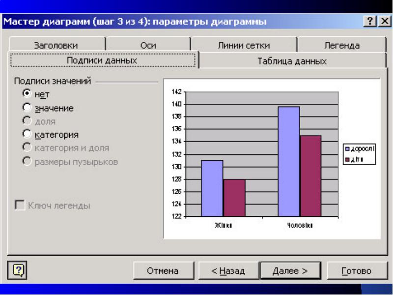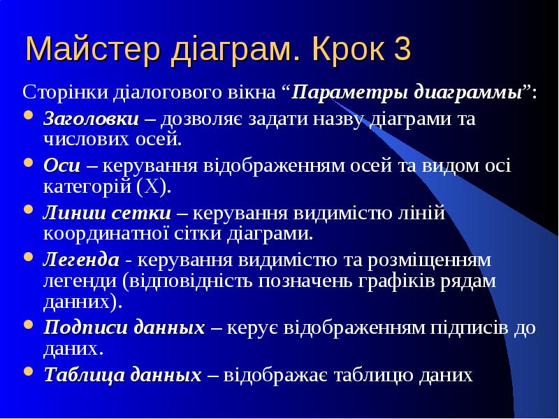 Заголовки – дозволяє задати назву діаграми та числових осей.