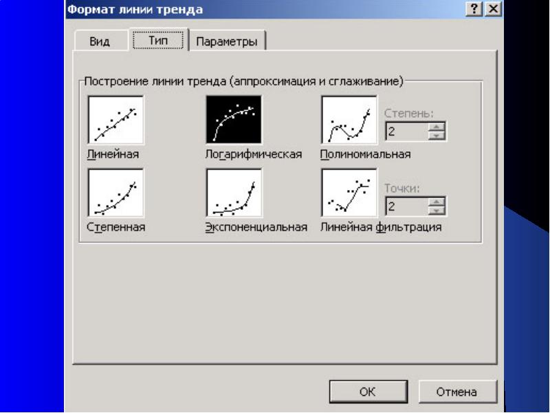 · В діалоговому вікні “ Линия тренда ” на вкладці “ Параметры ” можна вказати: