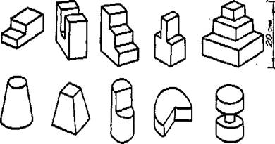 Дуже цінним для розвитку просторових уявлень учнів є виготовлені з картону чи дерева моделі геометричних тіл збільшеного розміру (20—25 см) різної конфігурації (мал. 3). їх використовують як для демонстрування конструктивної будови, так і для натурних постановок при малюванні. Для виготовлення таких моделей можна залучити батьків учнів або членів гуртка «Умілі руки». Фарбувати моделі найкраще у білий чи сірий колір.