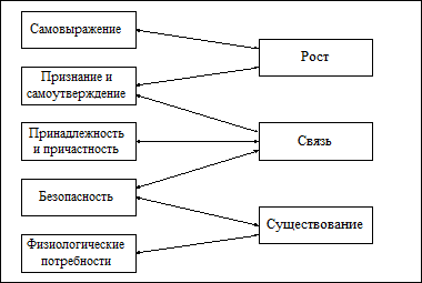 Теорию потребностей существования, связи и роста (или ЕRG — Ехistеnсе, Relations, Growht) разработал в 1972 г. американский ученый К. Альдерфер. Он предпринял попытку уточнить и творчески развить теорию иерархии потребностей А. Маслоу. Он выделил не пять, а три класса (группы) потребностей: существования, связи и роста.