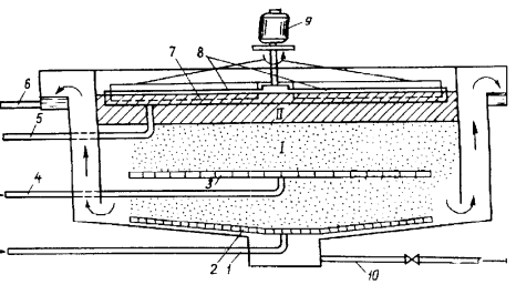 1. Зона флотації; 2. Розподільні труби робочої рідини; 3. Иловые розподільні труби; 4. Подача активного мулу або фугата; 5. Відвід ущільненого сфлотированного активного мулу фугата; 6. Відвід подиловой води; 7. Лоток для збору ущільненого активного мулу; 8. Шкребки; 9. Електродвигун; 10. Трубопровід спорожнювання.