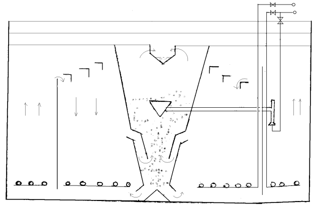 1. Стовбур шахти; 2. Зона аерації; 3. Внутрішня труба; 4. Эрлифтная зона; 5.6. Подача повітря 7. Відстійник; 8. Перегородка; 9. Впускні труби; 10. Аератори (фильтросные труби або тканевые аератори); 11. Иловые щілини; 12. Дірчасті труби эрлифты (забезпечується циркуляція активного мулу);. 13. Випуск очищеної води;