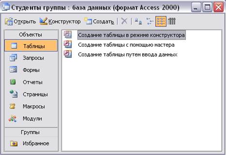 З об’єктами можна працювати, вибравши їх і натиснувши кнопку Открыть (або двічі натиснувши на об’єкті). Для створення нового об’єкта використовують кнопку Создать. Кнопка Конструктор використовується для зміни структури вже існуючого об’єкта і застосовується до будь-якого об’єкта вікна БД.