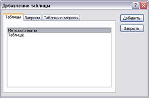 Відкривши вікно запиту, можна приступити до розробки нового запиту; її треба розпочати з додавання таблиць, з яких вибираються дані. Для цього необхідно в діалоговому вікні Добавление таблицы вибрати ту таблицю, або таблиці, які мають використовуватися в запиті. Кількість таблиць, що використовуються в запиті, необмежена. Крім таблиць, в запиті можуть використовуватися інші запити. При створенні запитів із декількома таблицями треба призначити загальне поле, яке зв’язує таблиці, пересуванням його з вікна однієї таблиці у вікно іншої. Запити, що використовують декілька таблиць, називають реляційними. Відкрити діалогове вікно Добавление таблицы можна, натиснувши на кнопці Добавить таблицу панелі інструментів або вибравши команду Запрос/Добавить таблицу. Додавши таблицю (таблиці) і/або запит (запити), закрити діалогове вікно Добавление таблицы.
