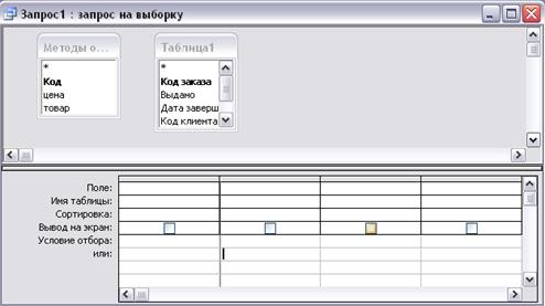 Вікно конструктора запиту розділене на дві частини. У верхній частині містяться вікна таблиць і запитів, які використовуються в запиті, що створюється, а в нижній – бланк запиту QBE, в якому задаються поля, що включаються, умови відбору і порядок сортування (якщо він необхідний).