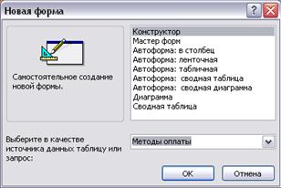 У діалоговому вікні Новая форма окрім пункту Мастер форм є й інші пункти. Розглянемо ці пункти, в яких перераховані режими створення форм і їх призначення: