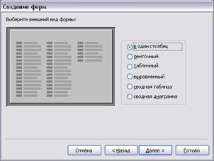 Якщо поля вибрані з однієї таблиці, то з’явиться діалогове вікно майстра форм (рис. 14), в якому треба визначити зовнішній вигляд форми. Можна вибрати такі варіанти, як в один столбец, ленточный, табличный, выровненный: