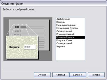 У наступному діалоговому вікні майстра форм (рис. 15) можна вибрати стиль форми. В Access є десять стилів фону для форм, які створює майстер форм. Після вибору стилю натиснути на кнопці Далее.