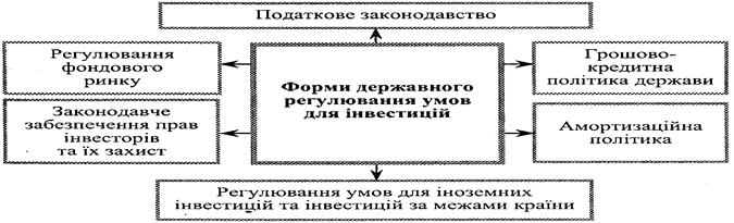 Погіршуючи ж цінові та дивідендні умови продажу своїх цінних паперів, держава стимулює їх викуп у юридичних і фізичних осіб. У результаті цього у останніх з'являються додаткові кошти, які через банківську систему або безпосередньо використовуються для фінансування інвестицій. Мета державного регулювання — вирівнювати такі циклічні тенденції, гальмуючи надлишкову інвестиційну активність у періоди піднесення та штучно стимулюючи інвестиції перед спадами виробництва. Загальну схему важелів державного регулювання умов інвестиційної діяльності.