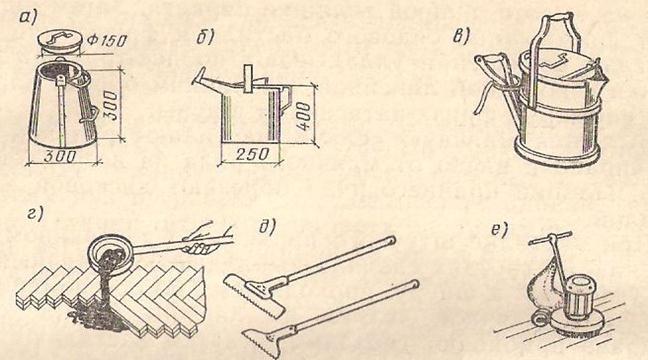 а – бак для мастики; б – лійка; в – інвентарна ємкість для переносу мастики; г – наклейка паркету; д – скребки для розрівнювання мастики; е – машина для острожки паркета.