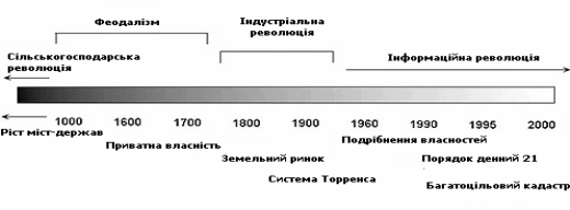 Вченим Тінгом запропонована класифікація епох в еволюції кадастрових систем країн Західної Європи (рис. 1). Природно, що кадастрові епохивідображають відповідні епохи в розвитку технологій та соціально-економічних відносин в суспільстві, оскільки власне земельні ресурси відносяться донайважливіших економічних категорій, а форми прав власності на землю взначній мірі визначають характер виробничих та інших соціально-економічнихвідносин. Кожну епоху можна характеризувати певною домінуючою функцією кадастру, яка відповідає соціально-економічним відносинам впродовж певногоперіоду: