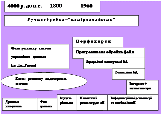 Склад та кількість кадастрових показників визначаються ”соціальним замовленням” системи регулювання земельних відносин певного періоду, а також рівнем економічно-доцільних і можливих витрат суспільства на збір, реєстрацію, накопичення та обробку кадастрових даних. Ці витрати залежать від рівня масових інформаційних технологій, зокрема, систем керування даними. Об’єктивність такого зв’язку можна прослідкувати на суміщеній часовій діаграмі (рис.2) зазначених вище епох розвитку кадастрових систем та шести фаз еволюції обробки даних за Дж. Греєм.