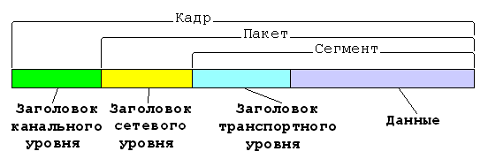 Передача даних через розгалужені мережі відбувається при використанні інкапсуляції/декапсуляції порцій даних. Так, повідомлення, що прийшло на транспортний рівень, ділиться на сегменти які отримують заголовки і передаються на мережевий рівень На мережевому рівні сегмент може бути розділений на частини (пакети), якщо мережа не підтримує передачу сегментів цілком. Пакет забезпечується своїм мережевим заголовком (тобто відбувається інкапсуляція сегментів в пакети). При передачі між вузлами проміжної ЛВС відбувається розподіл пакетів на кадри (тобто інкапсуляція пакетів в кадри). Структура кадру предатсвлена, що утворюється, на мал. 5.1. У приймальному вузлі сегменти декапсулируются і відновлюється початкове повідомлення.