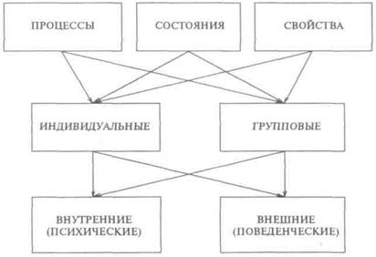 Помітимо, що багато хто з явищ, досліджуваних у психології, не можна беззастережно віднести тільки до однієї групи. Вони можуть бути як індивідуальними, так і груповими, виступати у вигляді процесів і станів. Із цієї причини в правій частині таблиці деякі з перерахованих феноменів повторюються.