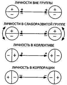 Замічено таку закономірність: чим ближче за рівнем свого розвитку група перебуває до колективу, тим більше сприятливі умови вона створює для прояву кращих сторін в особистостей і гальмування того, що в ній є гіршого. І навпроти, чим далі група за рівнем свого розвитку відстоїть від колективу й чим ближче вона перебуває до корпорації (так називають групу, у якій складаються відносини, протилежні колективістським), тим більші можливості вона надає для прояву в системі взаємин гірших сторін особистості з одночасним гальмуванням кращих особистісних устремлінь (мал.).