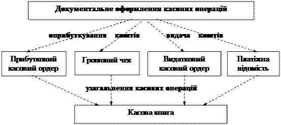 Касові операції – операції підприємств між собою та з підприємцями і фізичними особами, що пов'язані з прийманням і видачею готівкових коштів при проведенні розрахунків через касу підприємства з відображенням цих операцій у касовій книзі, книзі обліку розрахункових операцій. Оформлення касових операцій здійснюється з використанням документів наведених на рис. 8.