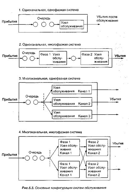 Основные конфигурации системы очередей. Системы обслуживания обычно классифицируются по числу каналов, например по числу серверов, и числу фаз, по числу позиций обслуживания, которые должны быть пройдены.