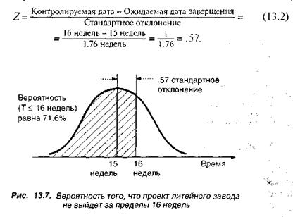 Вероятность завершения проекта. Анализ критического пути помог нам определить ожидаемое время завершения проекта литейного завода, которое равно 15 неделям. Но известно, однако, что, если проект не будет завершен за 16 недель, литейный завод будет закрыт службой контроля за окружающей средой. Она также знает, что имеется заметное различие во временных оценках для нескольких работ. Различия в продолжительности работ, находящихся на критическом пути, могут повлиять на общую продолжительность проекта, возможно на его задержку. Это обстоятельство волнует партнеров литейного завода.