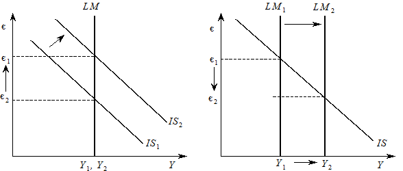 | Рис. 16.4. Стимулювальна фіскальна або торгівельна політика за плаваючого курсоутворення | Рис.16.5. Стимулювальна монетарна політика за плаваючого курсоутворення |