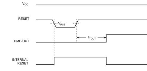 Внешний или аппаратный сброс реализуется подачей сигнала низкого уровня на вывод /RST. Сигнал низкого уровня должен сохраняться как минимум два периода такта системной синхронизации. Нарастающий фронт сигнала на выводе сброса /RST после превышения порогового напряжения включения V RST приводит в действие счетчик задержки Z1 (рис. 7.3), и, следовательно, - внутренний сигнал сброса. По истечение времени tTOUT внутренний процесс сброса заканчивается, и микроконтроллер переходит к выполнению программы, начиная с адреса 0.
