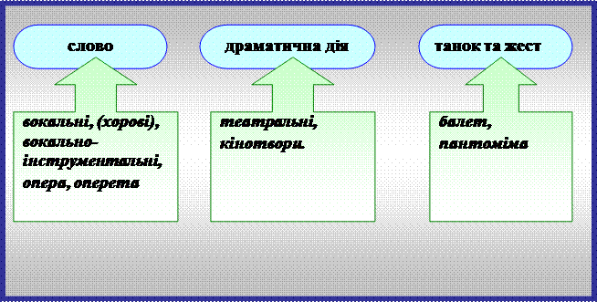 В гой же час музика може поєднуватись з іншими видами мистецтва, а саме: