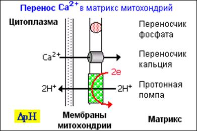 полем в матрикс, если мембрана для них проницаема. Во внутренней мембране имеется переносчик ионов кальция. Движение кальция снимает мембранный потенциал (Dj в уравнении 2), что приводит к довольно резкому возрастанию DpH, т.е. защелачиванию матрикса (см. рис. 6).