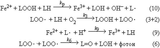 LO2· + LO2· -> L=O + LOH + фотон (6)