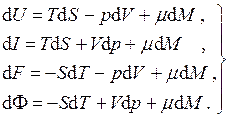 Изменение внутренней энергии такой системы будет происходить не только вследствие подвода теплоты и совершения над ней работы, но также и вследствие изменения её массы. Вещество, проникающее через оболочку, несёт присущую ему энергию. Тогда уравнения Гиббса для каждого из четырёх термодинамических потенциалов (5.3) и (5.5) следует дополнить ещё одним слагаемым, пропорциональным изменению массы системы, т.е.