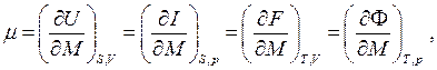 носит название химического потенциала и имеет смысл изменения энергии термодинамической системы при изменении её массы на единицу при поддержании постоянной той или иной пары независимых параметров системы.