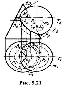 Плоскость Γ(Γ 1) параллельна плоскости Π 2 и совпадает с плоскостью симметрии данных фигур. Она пересекает конус по треугольнику, а сферу - по окружности, которые на фронтальной проекции изображаются очерковыми образующими и дают две экстремальные точки E(E 1, E 2) и F(F 1, F 2). Соединив полученные точки плавной кривой, получим искомую линию пересечения, Отметим, что фронтальная проекция искомой линии пересечения имеет вид параболы с вершиной M.