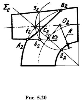 2. Из центра окружности 1-2 (точка К2) проводится касательная к проекции осевой окружности тора до пересечения с осью конуса (точка О2).