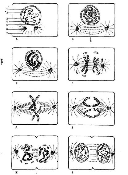 А — интерфаза (стадия «покоя»); Б — ранняя профаза (центриоль разделилась); В и Г— более поздняя профаза; Д— метафаза; Е и Ж— ранняя и поздняя анафазы; 3 — телофаза (ядерная оболочка исчезла, началось деление цитоплазмы); / — хромосома; 2 — центромера; 3 — ядрышко; 4— ядро; 5— ядерная оболочка; 6— центриоль; 7— звезда; 8— веретено