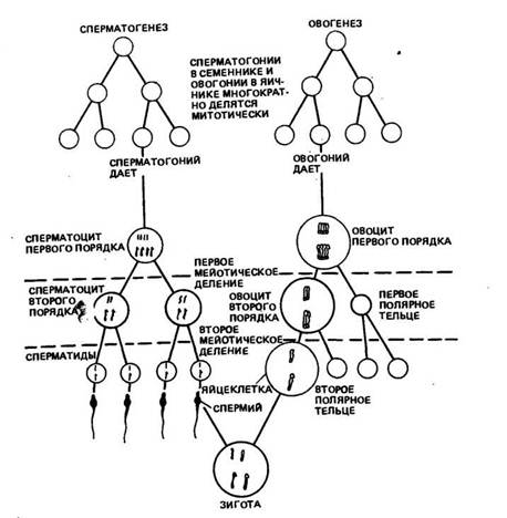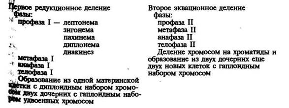 Наиболее ответственный момент с точки зрения генетики при образовании половых клеток — мейоз — процесс редукционного и эквационного деления ооцитов и сперматоцитов, в результате которого образуются половые клетки с гаплоидным набором хромосом. Рассмотрим наиболее важные моменты поведения вдомосом в мейозе. В этом процессе выделяют две стадии деления (см. схему): 1) редукционную и 2) эквационную.