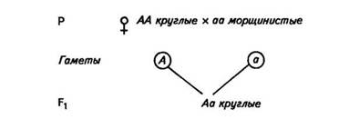 После того как было установлено, что круглая форма доминантна, а морщинистая рецессивна, можно обозначить генотип исходных родителей: с круглой формой — АА, с морщинистой — аа. В половые клетки растений попадает только один из этих генов. У cof№a с круглой формой семян все гаметы несли ген А, у сорта с морщинистой формой — ген а. В результате потомки Fi получили разные гены: от одного родителя — А, от другого — а, т. е. они были по генотипу гетерозиготны (Аа). По фенотипу полученные гибриды были все одинаковы — с круглыми семенами, независимо от того, какому растению принадлежали доминирующие признаки — отцовскому или материнскому.