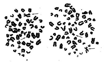 я — мегафазная пластинка с XX хромосомами; б — метафазная пластинка с XY хромосомами