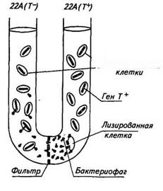 Трансдукция — перенос генов из одной бактериальной клетки в другую при помощи бактериофага. Впервые это явление установили в 1952 г. Н. Зиндер и Дж. Ледерберг. Они проводили исследования на патогенных для мышей бактериях Salmonella typhimurium. Были отобраны два штамма этих бактерий: штамм 22А ауксотрофный, не способный синтезировать триптофан (Т~), и штамм 2А, способный синтезировать триптофан (Т1"). Эти штаммы засевали в U-образную трубку, разделенную внизу бактериальным фильтром (рис. 24). В одно колено трубки засевали штамм 22А (Т~), в другое — штамм 2А (Т1"). После определенного периода инкубации бактерии штамма 22А при посеве на минимальную питательную среду дали небольшое количество колоний (частота появления трансдуцированных клеток была равна Ы0~5). Это свидетельствовало о том, что некоторые клетки приобрели способность синтезировать триптофан. Каким же образом бактерии могли приобрести это свойство? Исследования