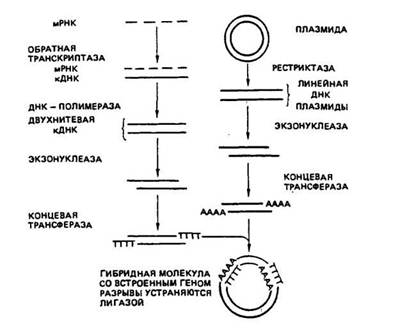 справа показано, что кольцевую ДНК векторной плазмиды разрезают рестриктазой и превращают ее в линейную форму, затем экзонуклеазой цепи укорачивают и концевой трансферазой пришивают к ним поли-А-последовательности. На последнем этапе соединяют оба типа молекул ДНК и получают гибридную молекулу — векторную плазмиду со встроенным в нее синтезированным геном. Разрывы в цепях ДНК воссоединяют лигазой.