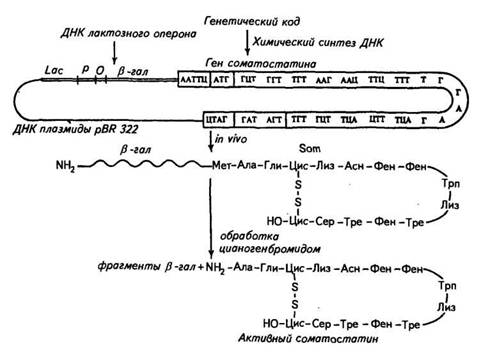Одно из наиболее важных для практики направлений генной инженерии — конструирование микроорганизмов-продуцентов нужных веществ. Первыми в этом направлении были исследования К. Итакуры и Г. Боейра с соавт. (1977). Им удалось добиться экспрессии гена, кодирующего гормон соматостатин в клетках кишечной палочки (рис. 27). Затем в разных странах клетки кишечной палочки использовались для синтеза ряда белков и гормонов человека и животных: инсулина, интерферонов, гормона роста, урокиназы, кальцитонина, альбумина, тимозина и др. В лабораториях А. А. Баева, Ю. А. Овчинникова, М. Н. Колосова, Е. Д. Свердлова и др. осуществлена экспрессия генов, кодирующих энкефалин, лейкоцитарный интерферон, брадикинин, сома-тотропин и др.