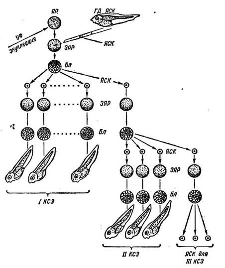 ЯР — яйцо-реципиент; ГД ЯСК — головастик—донор ядер соматических клеток; ЭЯР — энуклеированное яйцо-реципиент; ЯСК — ядра соматических клеток; Бл — бластула; КСЭ — клон серийных эмбрионов