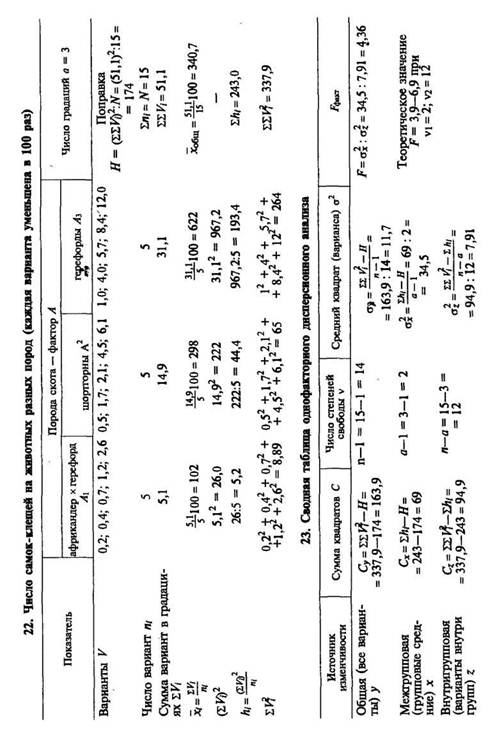 Нужно определить, влияет ли порода на устойчивость скота к клещам. Дисперсионный анализ обычно проводят при наличии различий между средними арифметическими. На одном животном у гибридов африкандер х герефорд в среднем было 102 клеща, у шорггорнов — 398 и у герефордов — 622 (табл. 22). Для упрощения расчетов каждую варианту разделили на 100, поэтому при вычислении х проводили умножение на 100. После всех вычислений заполняем свободную таблицу дисперсионного анализа.