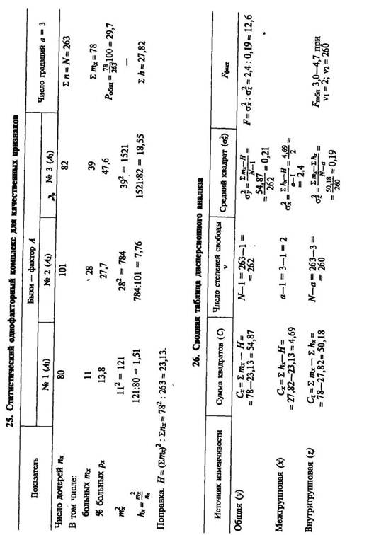 Дисперсионный анализ качественных признаков. Например, нужно определить влияние быков-производителей на резистент-ность дочерей к бруцеллезу. Заболеваемость дочерей трех быков была 13,8; 27,7 и 47,6 %. Составляют статистический комплекс (табл. 25), а потом данные заносят в сводную таблицу 26. Вычисляют F, находят табличные значения F (см. табл. 26), которые при vi = а—\ = 3—1 = 2 и V2 = N— а = 263—3 = 260 равны 3,0—4,7. Полученная величина F = 12,6 больше табличной F = 4,7 при р = 0,99.